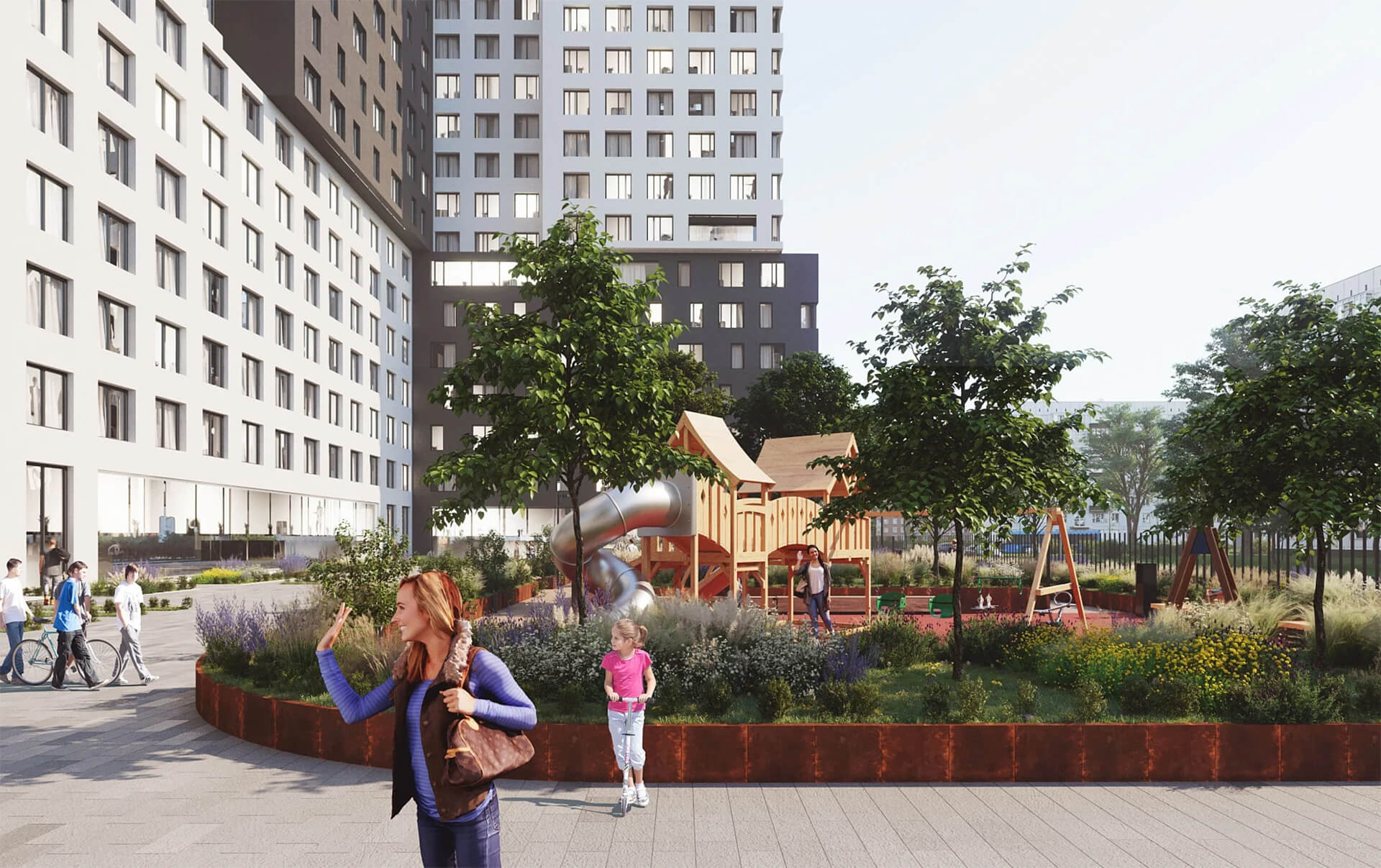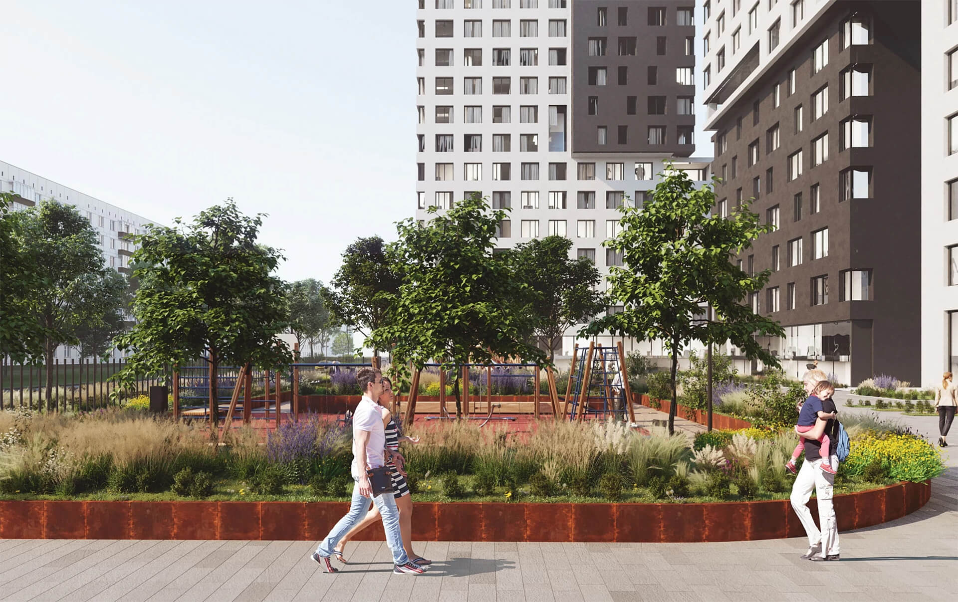 Архитектурная концепция предполагает разделение пространства на приватные жилые зоны и уютные общественные пространства. Входные группы оформлены в едином дизайнерском стиле и создают атмосферу комфорта уже с первых шагов. Внутренние дворы закрыты от машин, что делает территорию более безопасной и удобной для прогулок и отдыха.